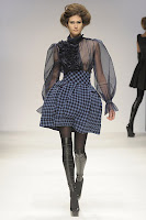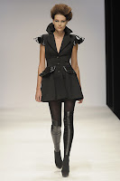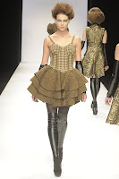 9.30am and we were greeted with a pre-show Dolly Parton sound track. It was then I knew that the first day of Fashion Week was going to be a goodun! For an early start, it was a massive turn out. Paul Costelloe opened London Fashion Week with a gold and black brocade dress; collared, zipped and accompanied by PVC over-the-knee leggings - a running accessory in the show. The collection continued with a slight Victorian cum 80s feel with muted tans, (more) big shoulders and full length, elegant coats belted at the waist. Three colours prevailed; black, blue and gold with a mash-up of varying shades of neutral. There was huge emphasis on the skirt - rah-rah, full, asymmetric bubble.