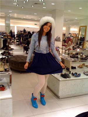 "Wellies are Viv Westwood new collection, cream tights Ebay (hope she washed them first!!!), navy dress is old school Topshop, denim jacket is Hurwundeki and the AMAZE hat is from my mum's wardrobe."