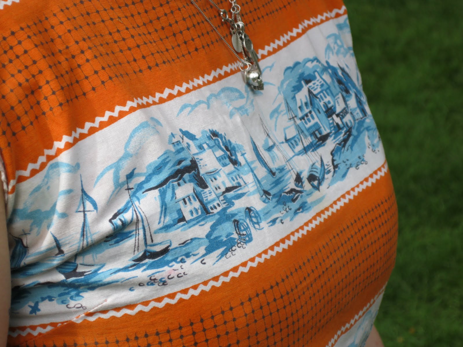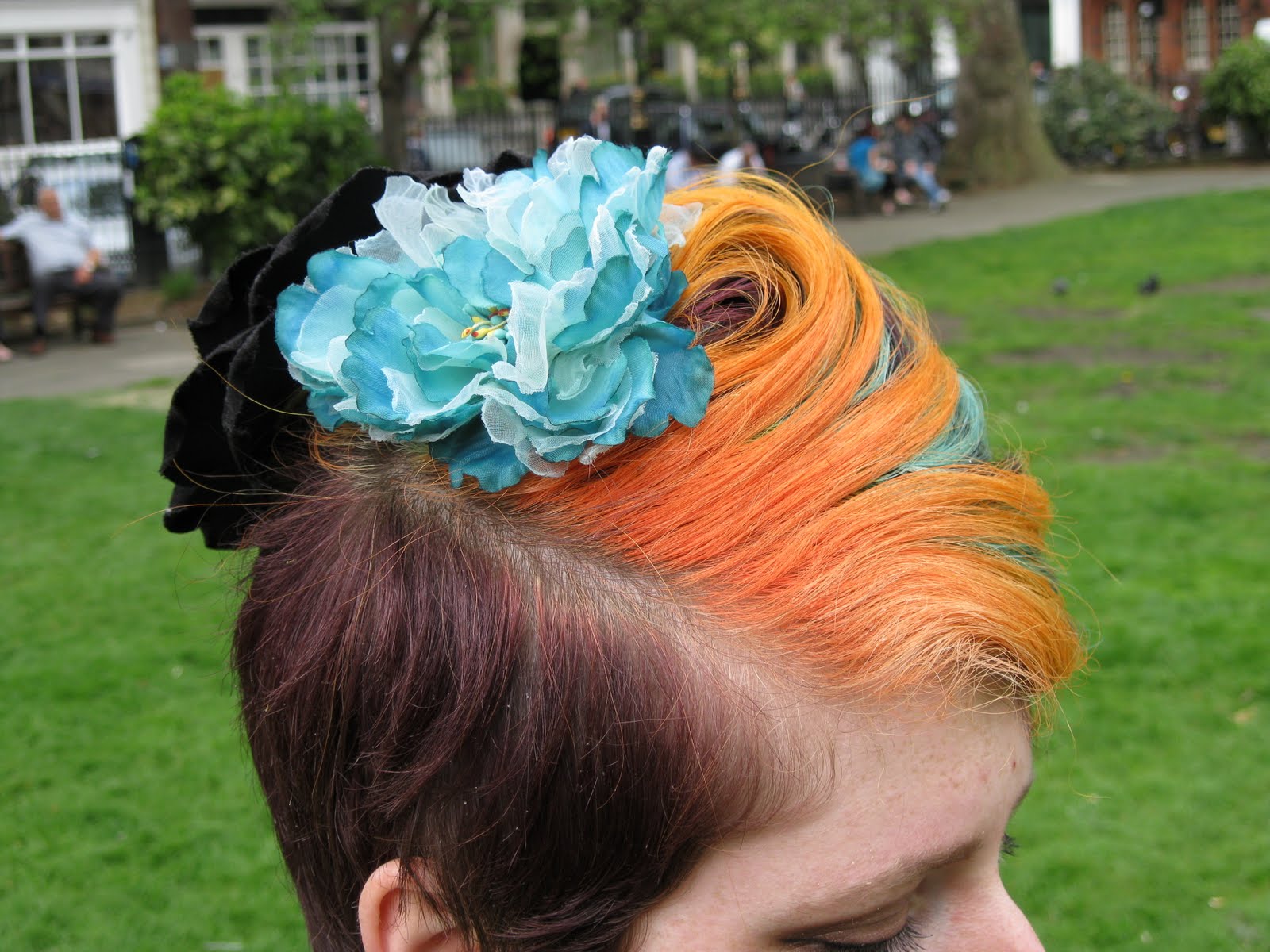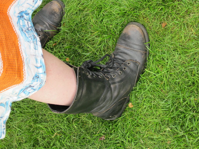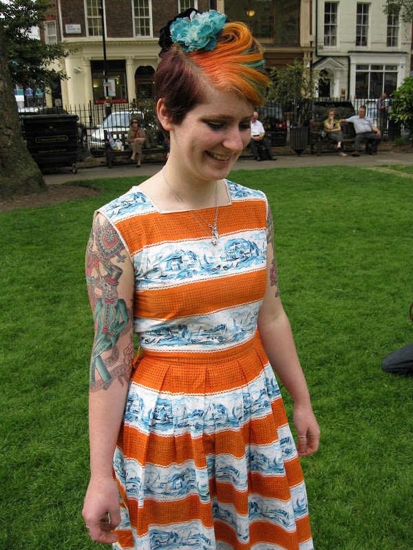 And the third I spotted a mile off! This fun-loving fashion junky, a Central St. Martin's student, was wearing a vintage orange and blue dress, and just look at the print detail! I was in love! What with her multi-coloured hair, intricate tattoos and biker boots, she was like a walking fashion story. J'adore everything about her!