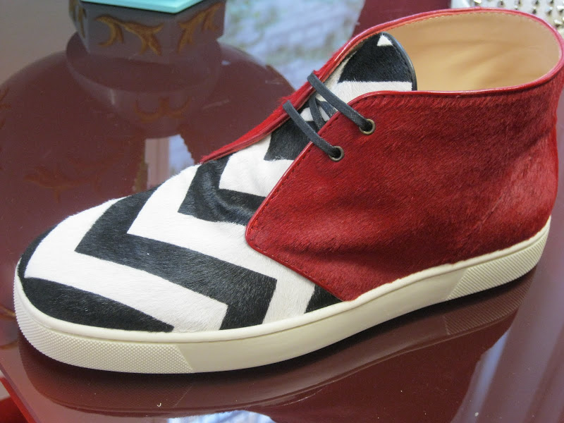When talking about the men's collection, Anne, the lovely PR manager, told me that: "Christian likes to keep things organic. When he's ready to bring more out, he will. He doesn't ever rush these things". I guess this is why his collections work so well. For men, I feel in love with the black, white and red chevron design calf skin shoes, leopard print studded slip ons and of course the amazingly sparkly trainers! LOVE a bit of shoe-bling.