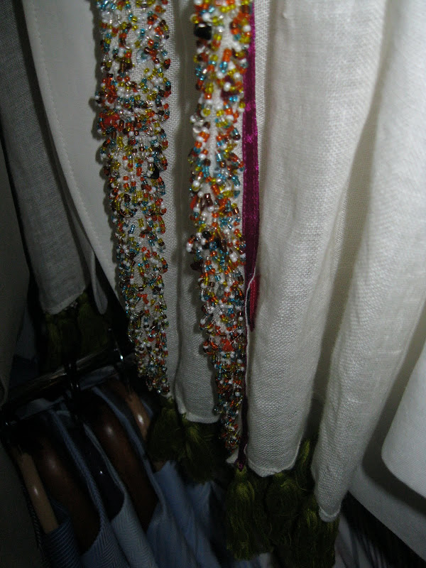 What I loved about this particular trip is the amount of fab men's stuff I found. Paul Costelloe is the obvious one, what with his incredible tailoring talents. For this season expect to find contrasting collars from Paul; brown suits with red collars, tweed jackets with brown collars. The linings he uses are utterly gorgeous too, purple silks and swirly patterns. The beaded scarf (below) was one of the best surprises from my visit to Chase. I even gasped. The colours were out of this world, with green tasseled ends to finish it off.