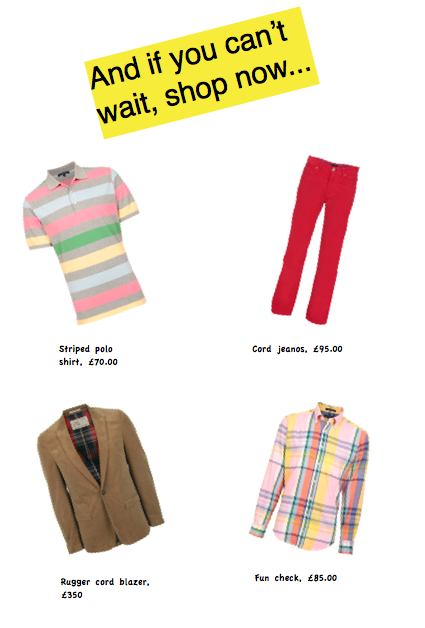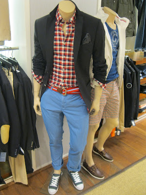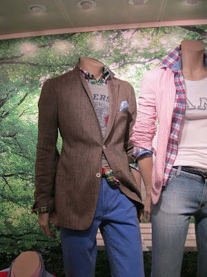 If you want a quick injection of colour, take a look below. What really struck me was the fab styling on the mannequins; darker jackets with bright trousers and a glimpse of a colourful check or fun t shirt underneath. As prep goes... this seems to be the Holy Grail.