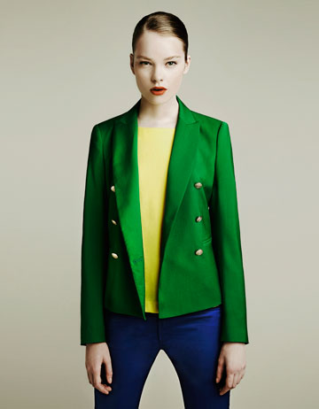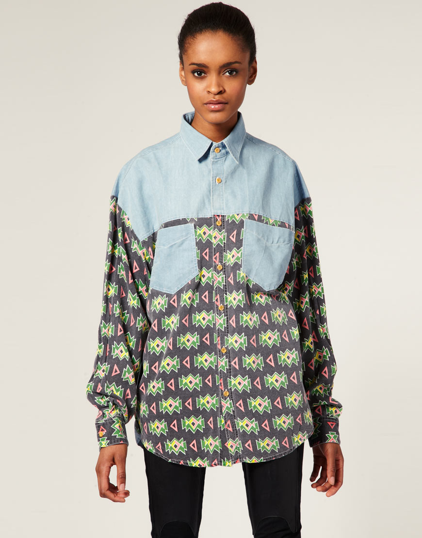 Horace's denim and aztec print oversized shirt, £70; Zara's injection-of-colour double breasted blazer, £69.99