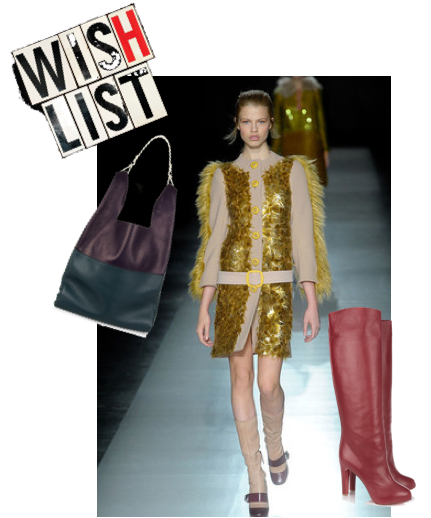 *Prada's yellow and beige fish-scale sequin and fur coat dress, reminiscent of Anna Dello Russo* *Christian Louboutin's red knee high boots* *Jil Sander's two-tone market bag*