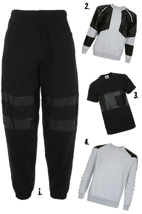 1. Joggers, £55 2. Mesh panel sweater, £75 3. Leather detail Tee, £30 4. Stud detail sweater, £60 Leave a comment